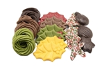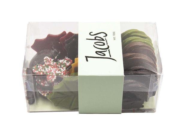 Een doosje met mooie kerstchocolade, zoals kransjes en hulstblaadjes. Verpakt per 200 gram.